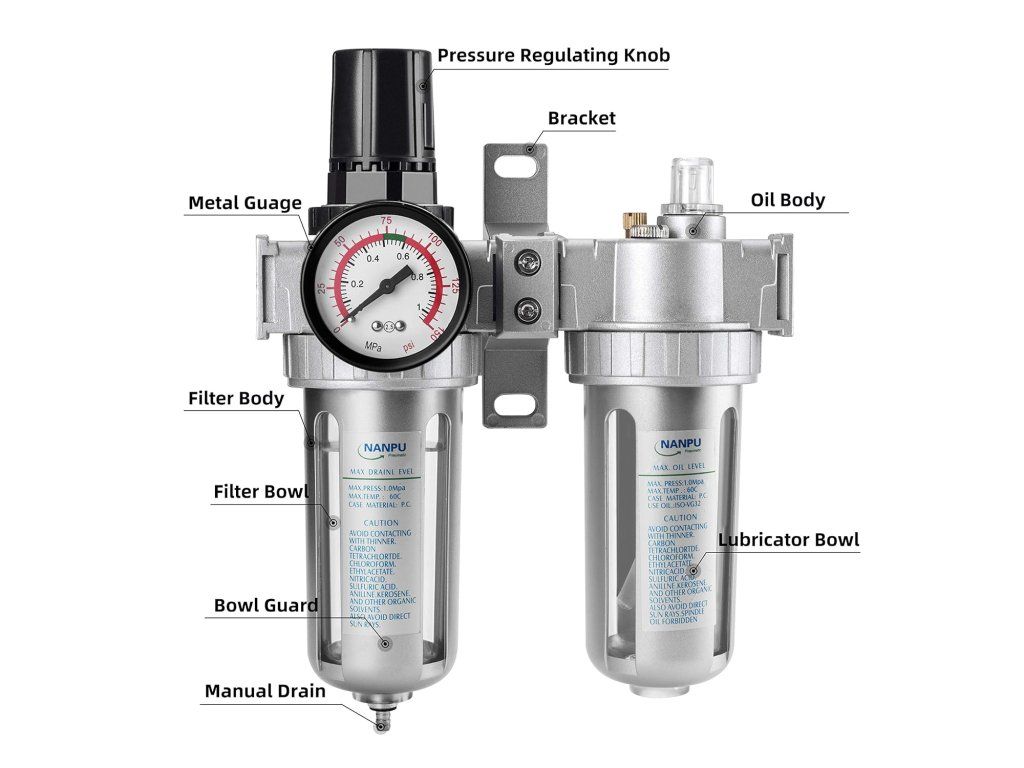 Kompaktná 3v1 jednotka NANPU na úpravu stlačeného vzduchu kombinuje filter, regulátor tlaku a mazač v jednom zariadení. Zaisťuje čistý, suchý a premazaný vzduch s presnou reguláciou tlaku 0-125 psi. Pripojenie 1/4" NPT, prietok 23 SCFM, ideálny pre dielne a pneumatické náradie.