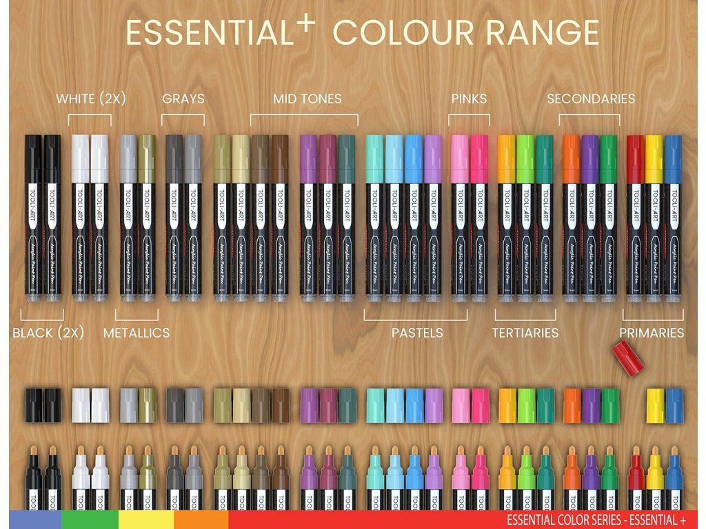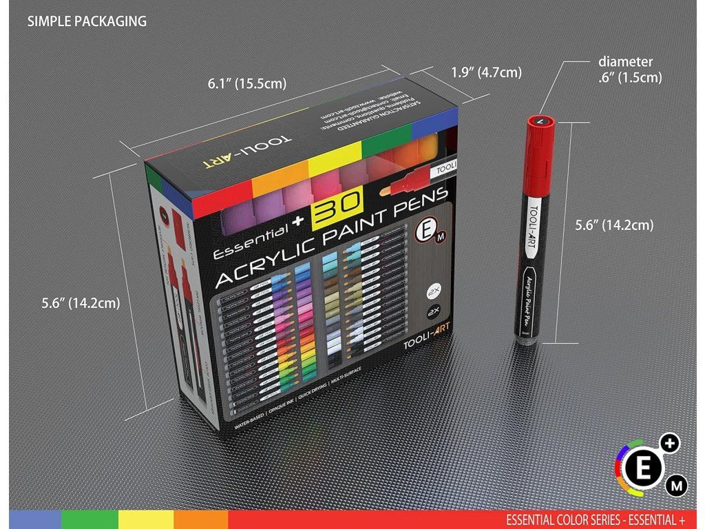 Obsah balení: 30 akrylových popisovačů (včetně 1 extra černého a 1 extra bílého), náhradní hroty. Technické údaje: střední hrot ~3 mm, inkoust vodou ředitelný akrylový, barvy ESSENTIAL M, voděodolné (water resistant), hmotnost balení cca 660 g, počet kusů 30, model AS30, výrobce TOOLI-ART. Doporučeno pro věk 14+; pro dospělé a profesionální použití, nehračka.