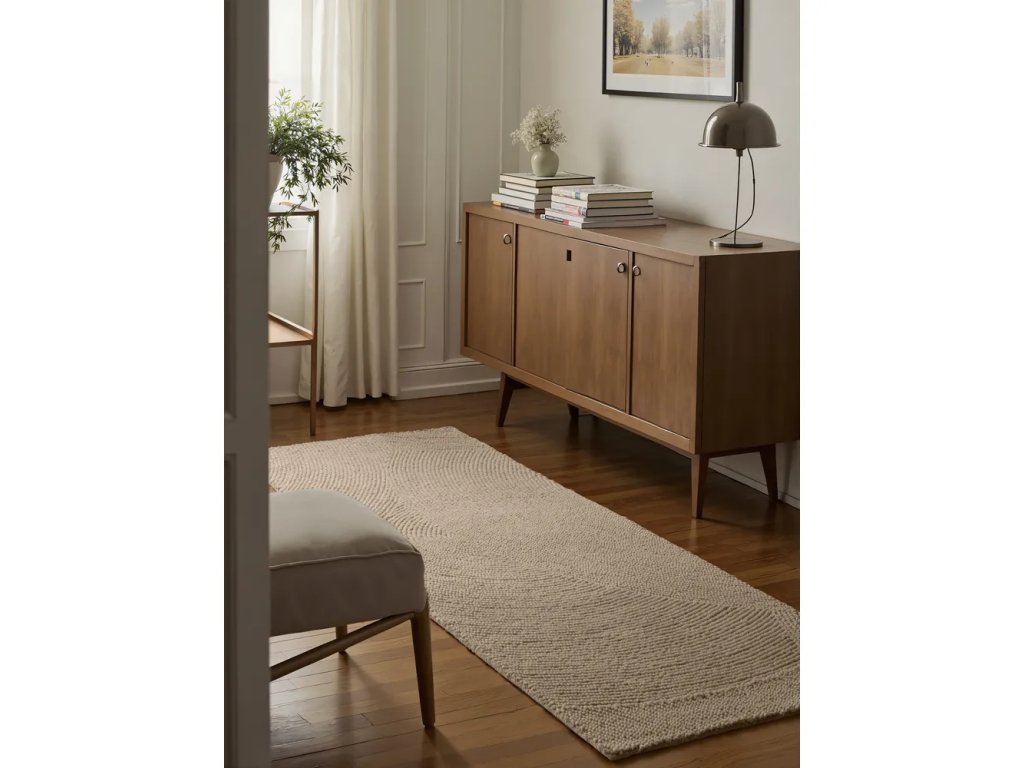 Běhoun je vyroben ručně ze 100% vlny. Toto přírodní vlákno nabízí trvanlivost a pohodlí po celý rok. Běhoun se snadno udržuje a je vhodný i pro podlahové vytápění. Počáteční vypadávání vláken je normální a časem se při pravidelném vysávání zmírní.