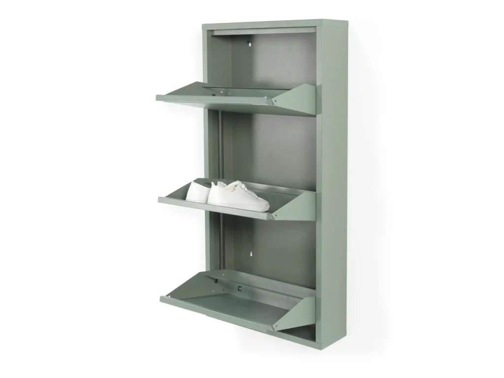 Výklopný, kovový, povrchová úprava: práškový lak, zelený/sivý, počet párov topánok 6, šírka 50 cm, výška 103 cm, hĺbka 15 cm.