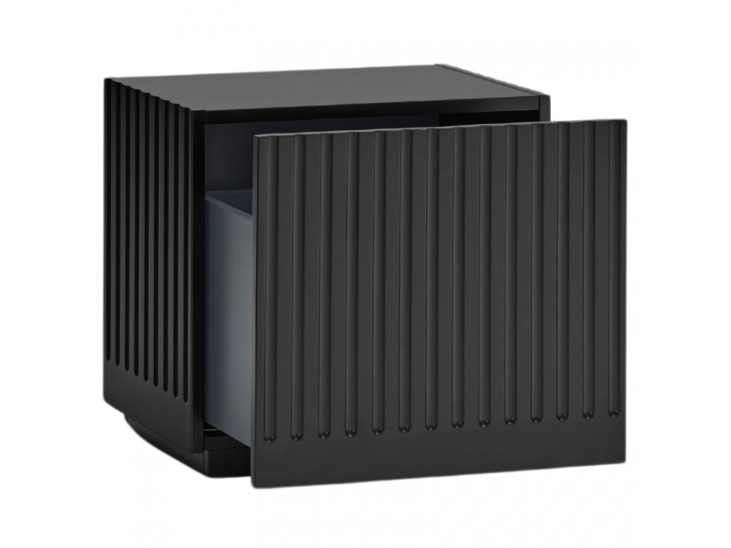 Díky nadčasovému designu je ideálním doplňkem každého moderního interiéru. Zajímavým designovým prvkem je vzorek na předních dvířkách a po stranách, který nábytku dodává na osobitosti a stylu. Noční stolek je vyrobený z lakovaného MDF v elegantní černé barvě. Disponuje praktickou velkou výsuvnou zásuvkou.