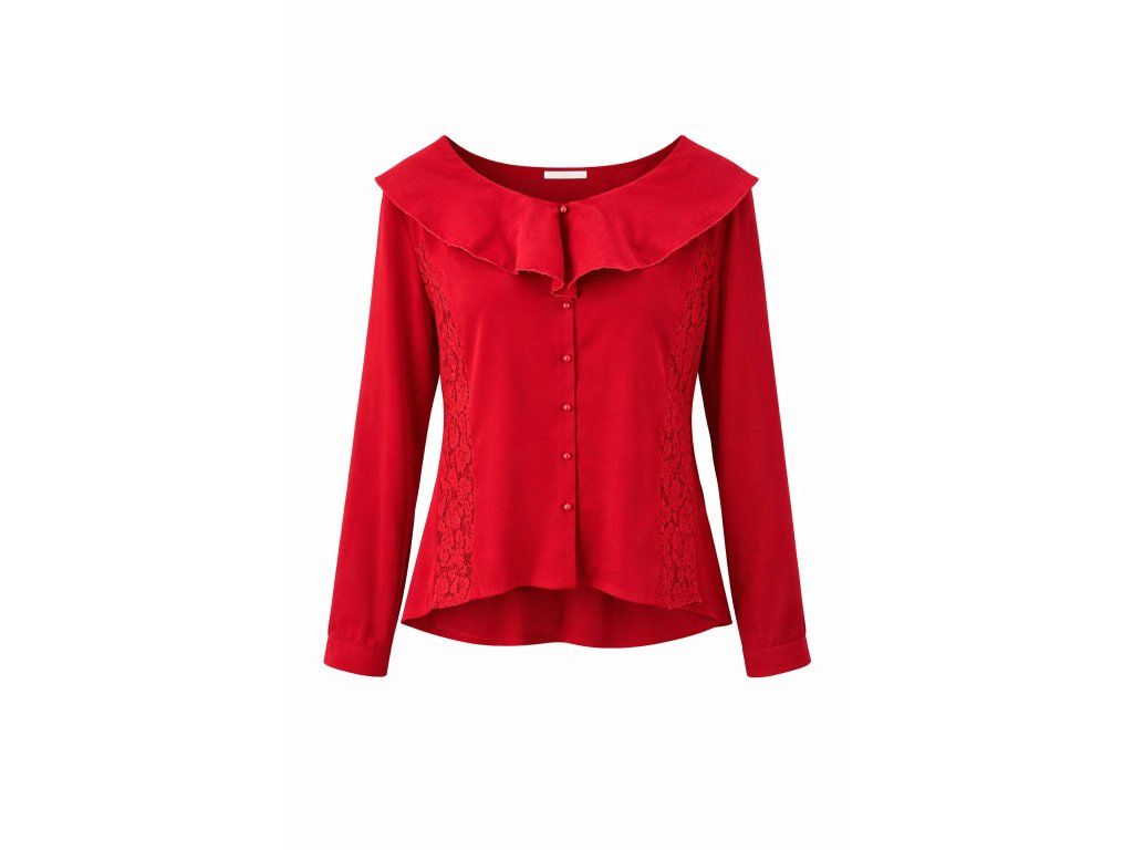 Elegantná dámska blúzka značky Sweewe v červenej farbe s okrúhlym golierom a krajkovými detailmi. Dlhé rukávy so zapínaním, perličkové gombíky na prednom diele. Vyrobená zo 100% polyesteru na pohodlné nosenie. Dostupná vo veľkostiach S, M, L.