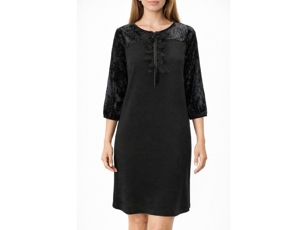 Elegantné dámske šaty Expresso v čiernej farbe s 3/4 rukávmi v imitácii zamatu. Zdobené čipkou a romantickou mašličkou pre dokonalý ženský vzhľad. Materiál 99% viskóza a 1% elastan zaisťuje maximálne pohodlie pri nosení. Dostupné vo veľkostiach 36, 38, 40 a 46. Ideálne pre elegantné príležitosti, do práce alebo na večierky.
