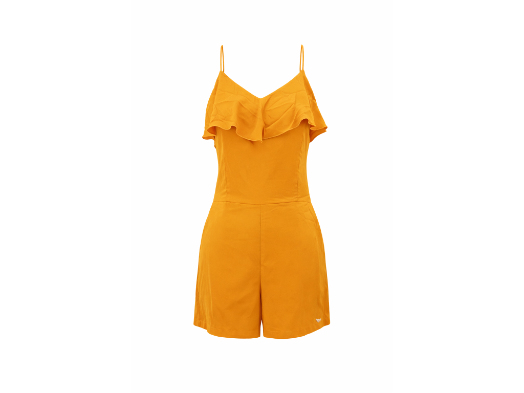 Trendy dámsky kraťasový overal LPB Woman v krásnej farbe šafranu. Vyrobený zo 100% polyesteru, vzdušný a ľahký materiál. Zapínanie na zips na strane, ozdobný volán na hrudi, výstrih v tvare V. Šnúrka so zlatou koncovkou na chrbte, 2 praktické vrecká na bokoch a zlatý štítok s logom.