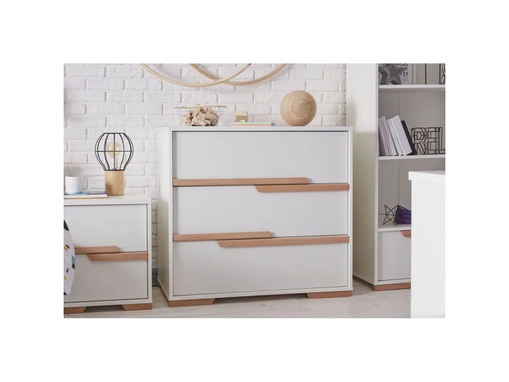 Stylová a jednoduchá. Taková je jak značka Pinio, tak i tato komoda z řady Snap. Konstrukci tvoří dřevovláknitá deska v bílé barvě s detaily z bukového dřeva, která přináší do interiéru lehkost skandinávského stylu. Kromě tří zásuvek nabízí plochu pro přebalovací pult.
