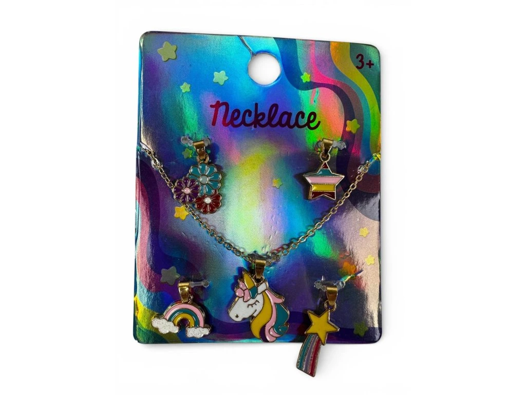 Detská sada náhrdelníka s 5 farebnými príveskami v hravom dizajne. Obsahuje motívy motýlika, jednorožca, morské mušle, šiat a blesku. Ľahký materiál s bezpečným zapínaním na pohodlné nosenie. Ideálne pre deti od 3 rokov ako každodenný doplnok alebo darček k špeciálnym príležitostiam.