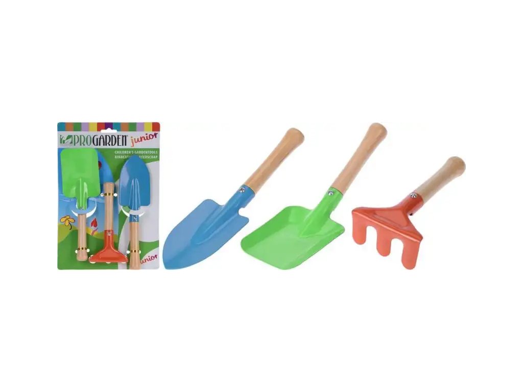 Materiál dřevo a kov. Dětské zahradní nářadí, kovové, násada dřevěná, sada 3ks, rýč 21cm, hrabličky 15 cm, lopatka 20 cm.