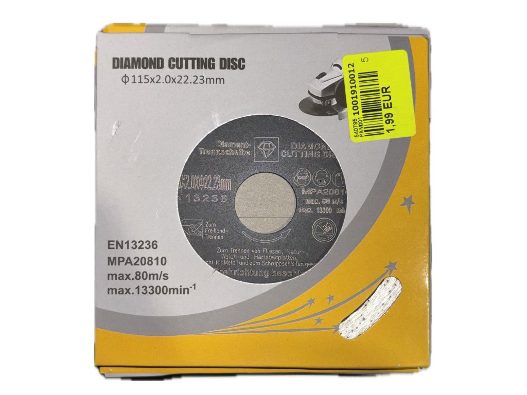 Diamantový řezný kotouč (DIAMOND CUTTING DISC). Rozměry: Průměr 115 mm, tloušťka 2,0 mm, průměr otvoru 22,23 mm. Použití: Pro řezání dlaždic, přírodního kamene, měkkého a tvrdého kamene. Není určen pro kov nebo hrubé broušení. Max. rychlost: Maximální obvodová rychlost 80 m/s, maximální otáčky 13300 min⁻¹.
