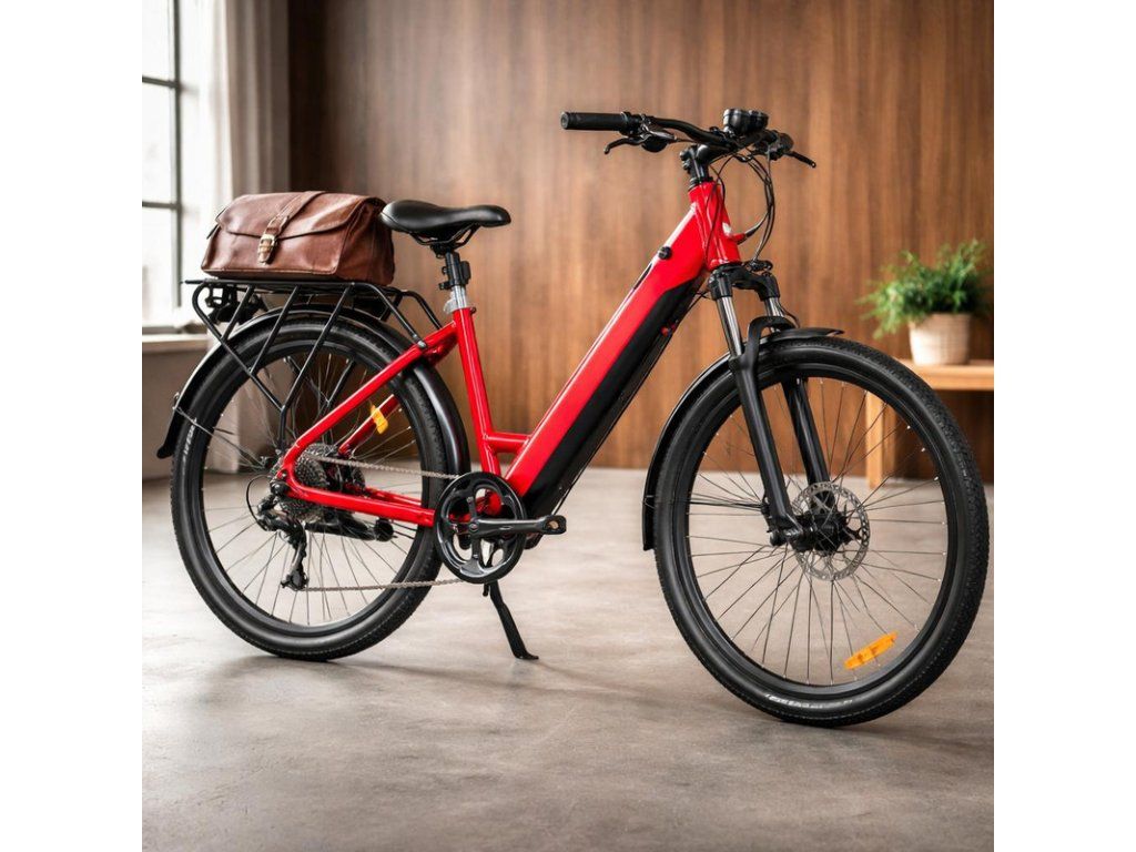 Moderný mestský elektrobicykel v elegantnom červenom prevedení je ideálnou voľbou pre každodenné dochádzanie aj víkendové výlety. Rám s nízkym nástupom zaisťuje pohodlné nasadanie a ergonomickú jazdnú pozíciu, zatiaľ čo integrovaná batéria v ráme dodáva koliesku čistý a minimalistický vzhľad.