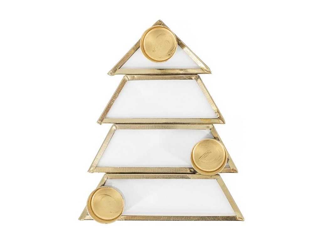 Stylový stojan na svíčky zlaté barvy ve tvaru (vánočního) stromečku s místem pro 3 svíčky. Ať už svíčky zapálíte nebo ne, na vašem konferenčním stolku, příborníku nebo na jídelním stole (o Vánocích) to bude opravdový poutač. Tento svícen je vyroben z kovu a skla a má rozměry 3x13x11cm.