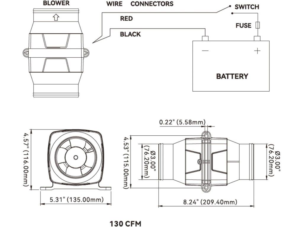 Výkonný 12V in-line ventilátor s prietokom 130 CFM a nízkou spotrebou (2,5 A). Tichá prevádzka, odolné ABS prevedenie, certifikácia ISO 8846/CE/RoHS.