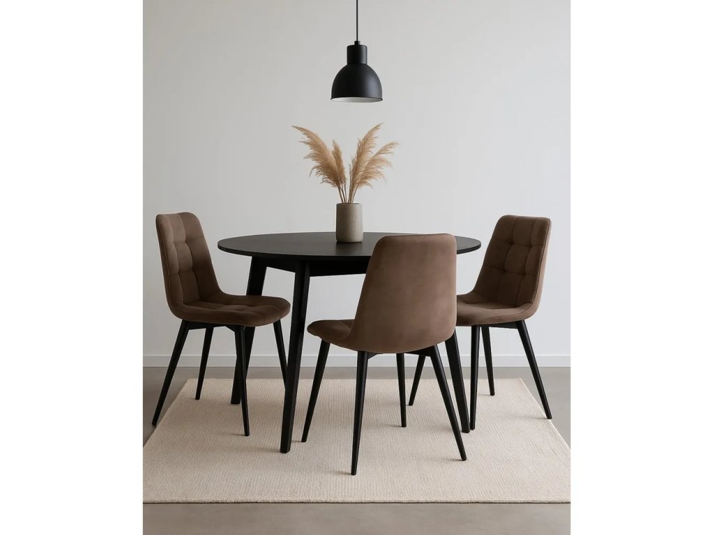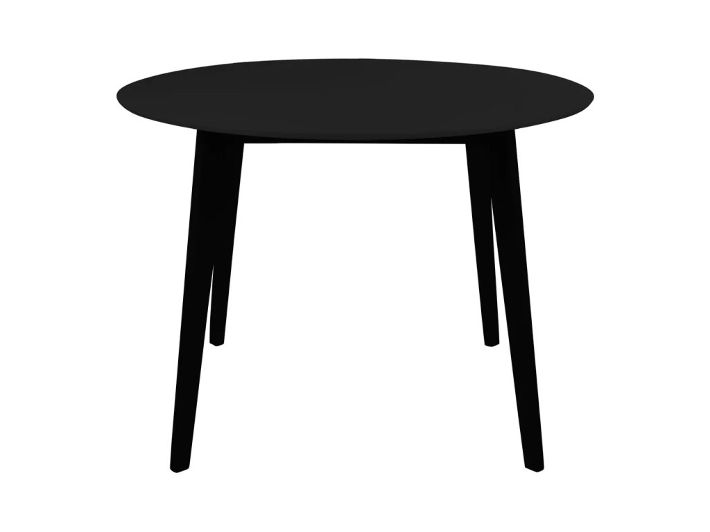 Okrúhly jedálenský stôl Vojens s priemerom 105 cm pre 4 osoby v elegantnom čiernom prevedení. Doska z kvalitnej MDF s lakovaným povrchom a pevné nohy z masívneho kaučukového dreva. Výška 75 cm, nosnosť 30 kg. Ideálne do moderných aj klasických interiérov.