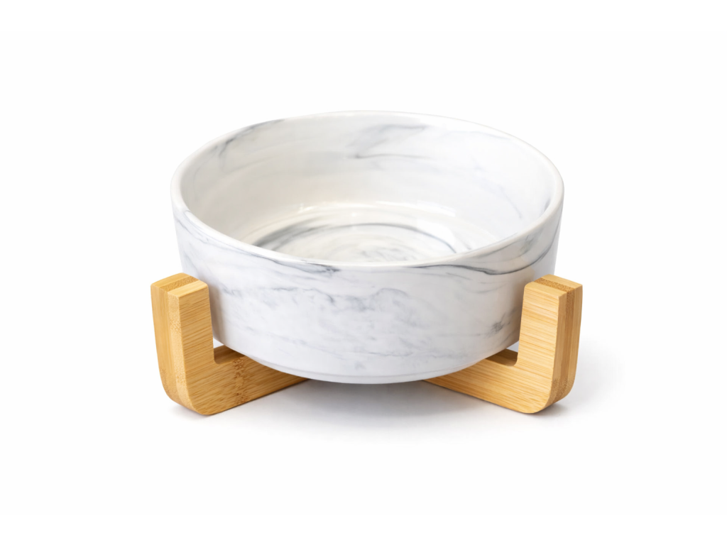 Keramická miska vhodná na vodu aj na kŕmenie je umiestnená v peknom drevenom stojane.