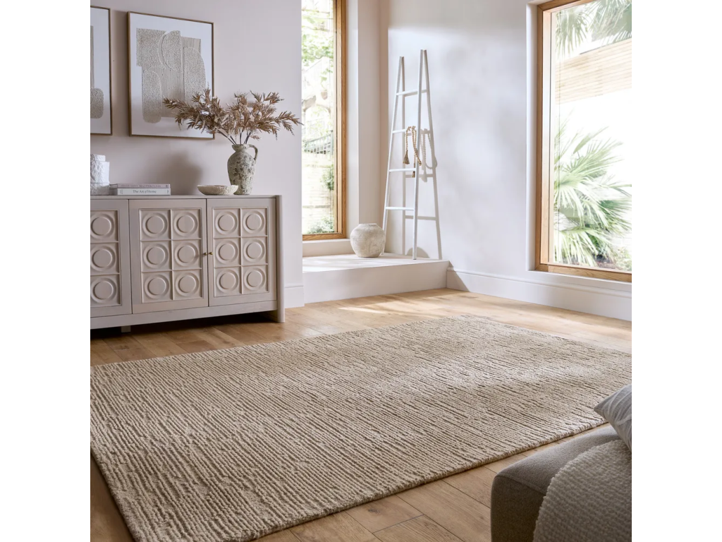 Ručne tkaný, vlnený, so strednou dĺžkou vlasu, béžový, 200x290 cm.