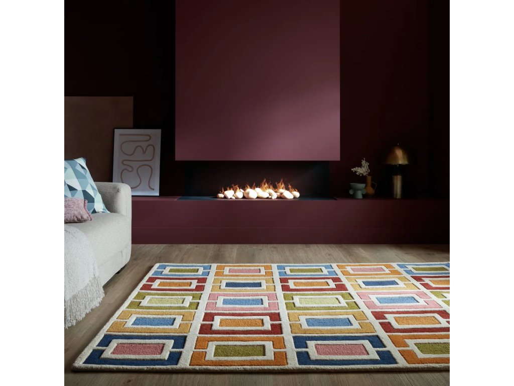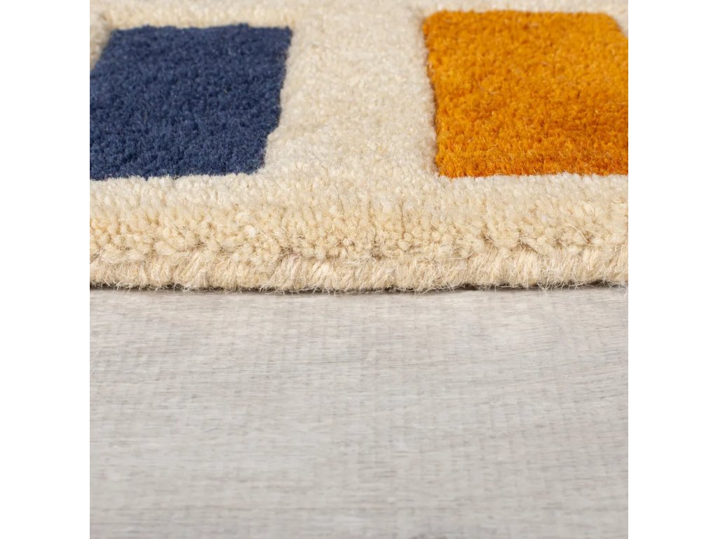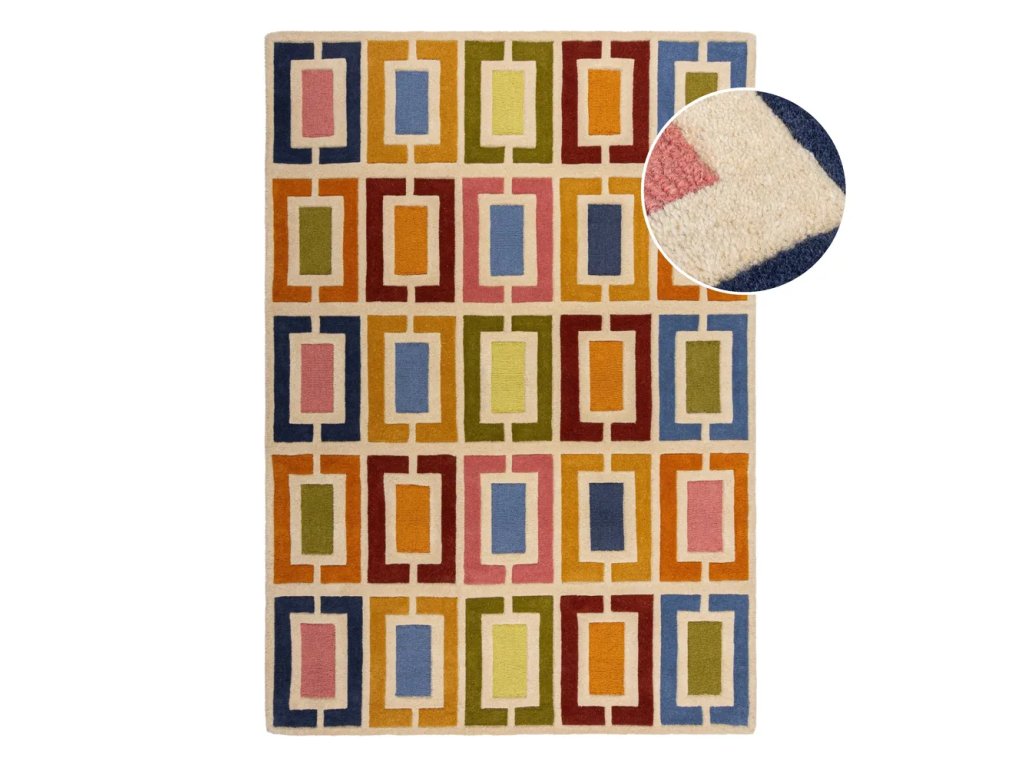 Nechte se nalákat na tento prémiový koberec kombinující širokou paletu zářivých barev s geometrickým vzorem, který do vašeho domova vnese nádech vintage stylu. Jeho vysokou kvalitu povrzuje ruční výroba výhradně z přírodních vlněných vláken pro zajištění dlouhotrvající odolnosti a přirozené tepelné a zvukové izolace. Výrazné geometrické tvary jsou pak výsledkem ručního střižení.