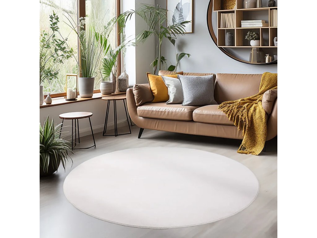Prateľný, syntetický, s nízkym vlasom, okrúhly, krémový, ø 160 cm.