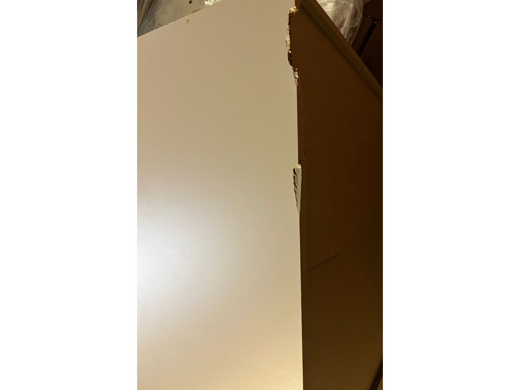 Poškodená horná doska viď foto. Komoda je zložená. Ide o zadnú stranu hornej dosky. RIEŠENIE JE PREKRYTIE TENKOU LIŠTOU V ŠEDEJ FARBE.