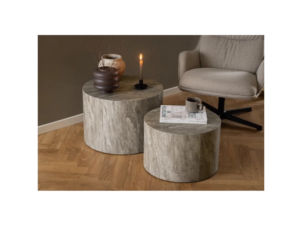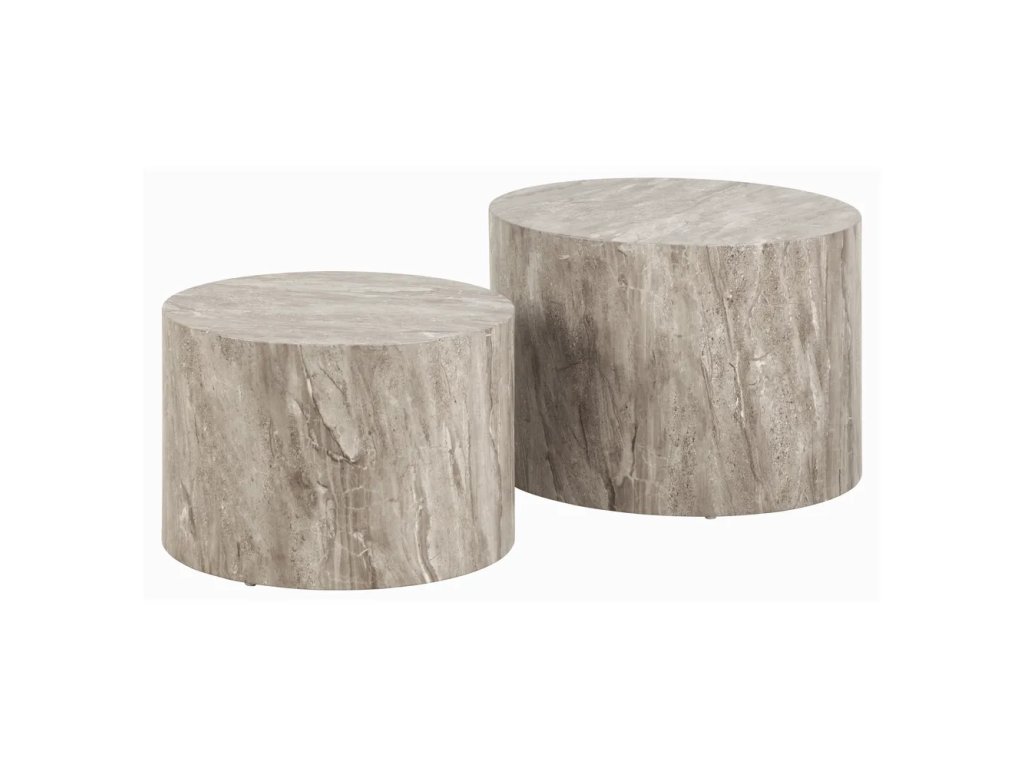 Menší - Ø50x33 cm, větší - Ø58x40 cm. Počet kusů 2 ks Průměr 58 cm Výška 40 cm Váha 17.3 kg Nosnost 20 kg Tvar Kulatý Materiál desky stolu MDF Dekor Matný Povrchová úprava Papír Materiál nohou MDF Péče Čistit vlhkým hadříkem nebo houbičkou, nepouživat agresivní a abrazivní čističe
