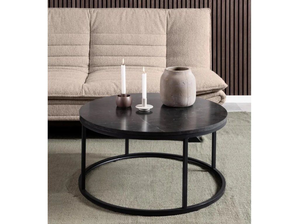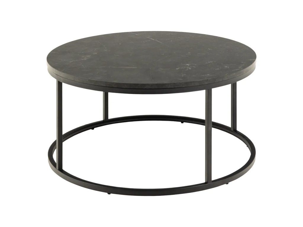 Štýlový okrúhly konferenčný stolík Actona Spiro v čiernej farbe s elegantným dekorom mramoru. Priemer 80 cm, výška 40 cm. Doska z MDF s melamínovou povrchovou úpravou, čierne oceľové nohy. Nosnosť až 20 kg. Ideálne do moderných obývacích izieb.
