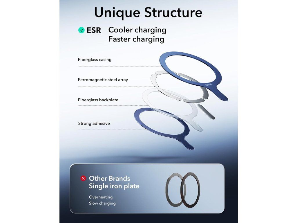 Kovový kroužek ESR je ideálním řešením pro přidání MagSafe kompatibility k vašemu stávajícímu pouzdru. Tenký design ze zinku zajistí stabilní přichycení MagSafe příslušenství a přesné vycentrování při bezdrátovém nabíjení, aniž by zvětšil objem telefonu.