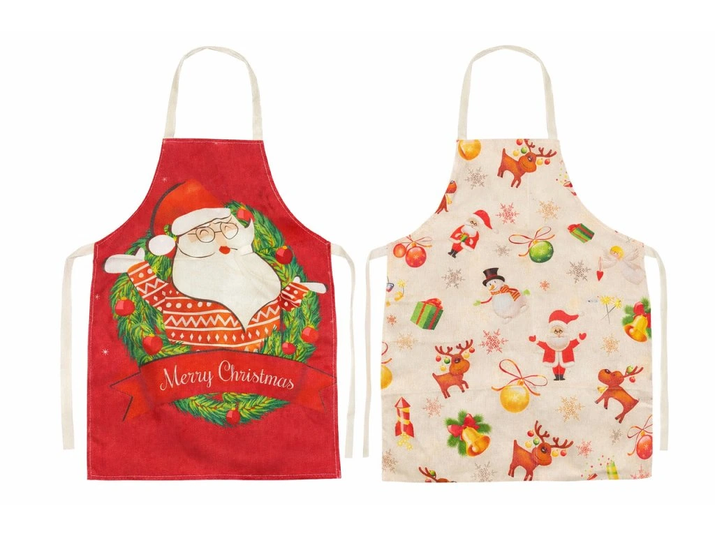 Štýlová vianočná zástera, ktorá vnesie sviatočnú atmosféru do každej kuchyne. Z jednej strany zdobená výrazným motívom Santa Clausa s nápisom „Merry Christmas“, z druhej hravým vzorom plným sobov, ozdôb a vianočných symbolov.