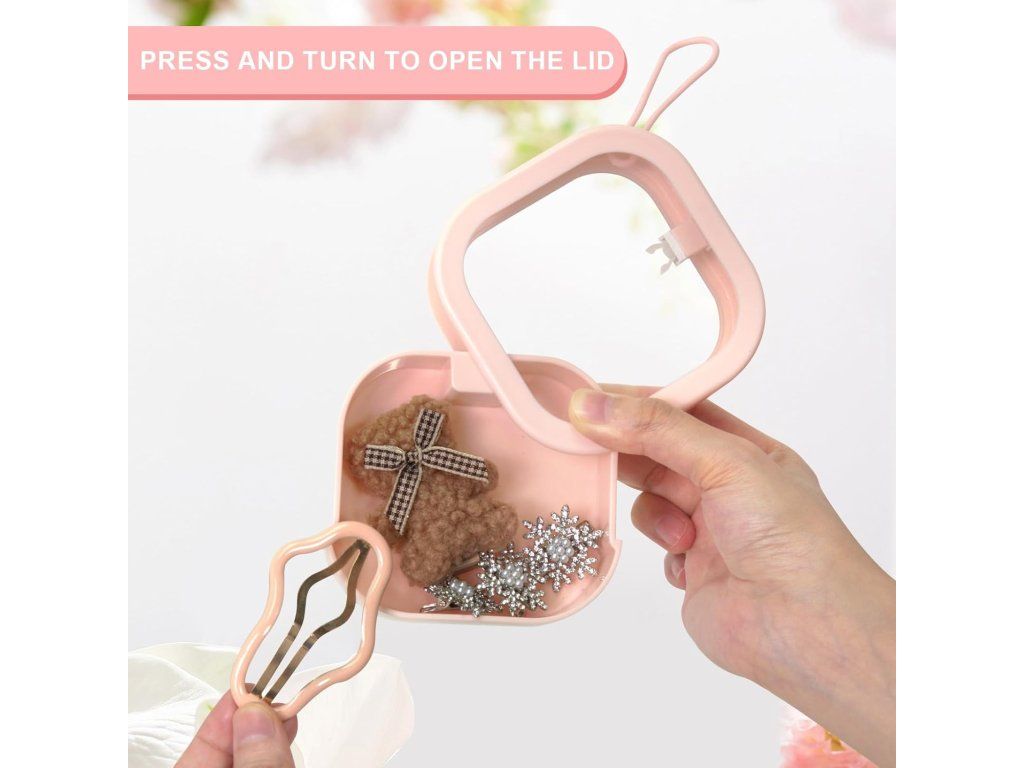 Praktický mini organizér pro uložení gumiček (scrunchies), spon, vatových tyčinek a dalších drobností. Díky průhlednému víku a bezpečnému tlačítkovému uzávěru rychle najdete, co potřebujete, a věci zůstanou na svém místě — ideální do kabelky i na cestování.