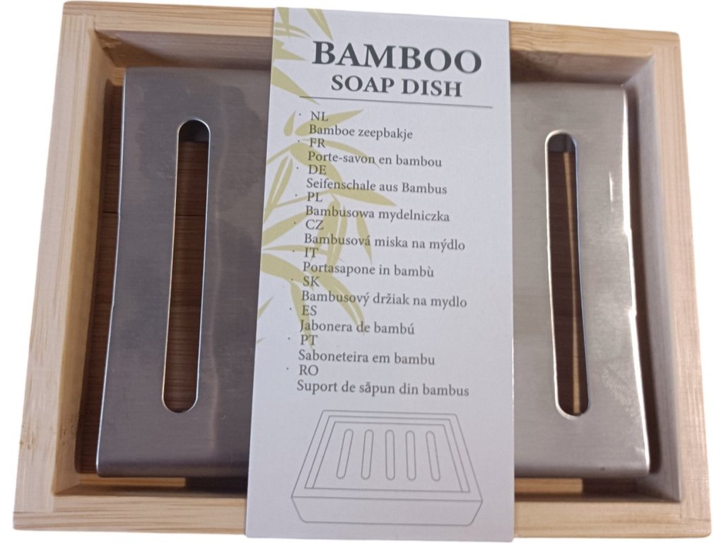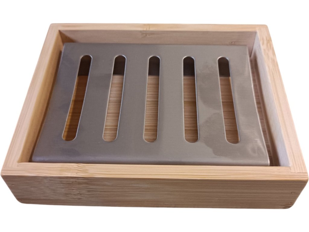 Táto miska na mydlo je vyrobená z bambusového dreva a nerezovej ocele.