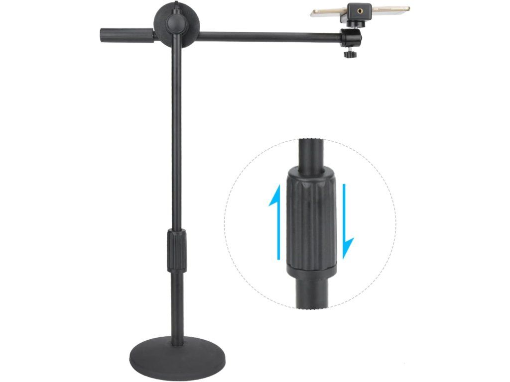 Praktický a pevný stolní stojan na mobil navržený pro pohodlné natáčení, streamování i hands‑free používání. Kovová konstrukce se širokou kruhovou základnou zajišťuje stabilitu a možnost přesného nastavení z více úhlů.