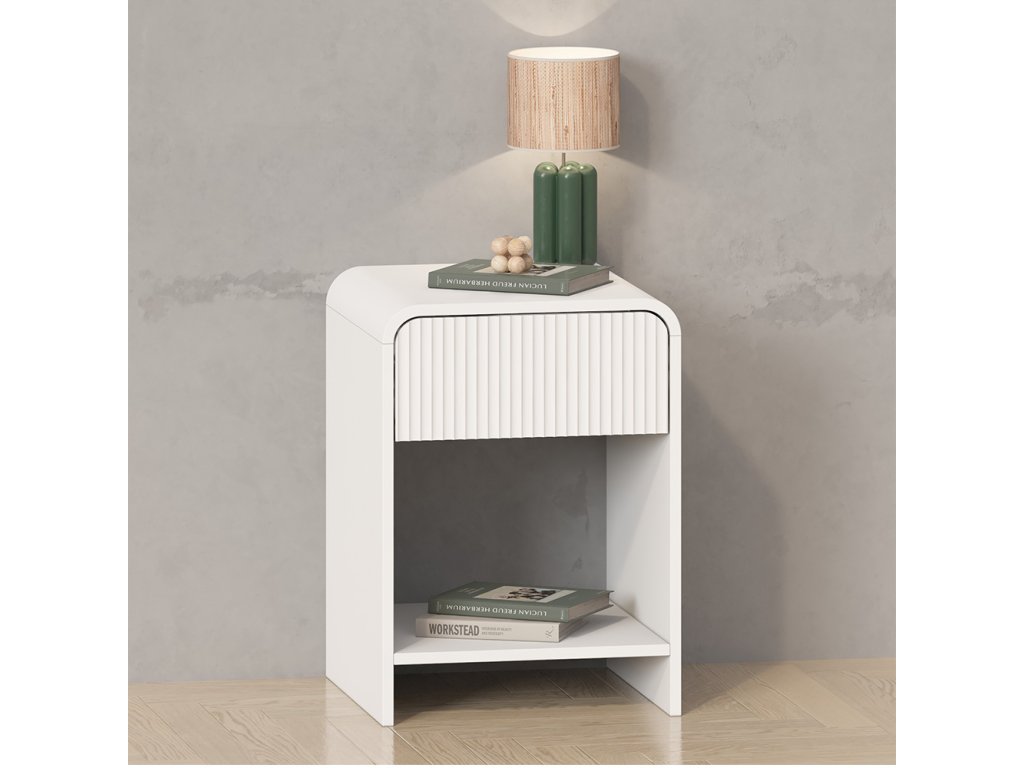 Moderní design: Bílý noční stolek se zaoblenými rohy a jemnou žebrovanou texturou na zásuvce pro luxusní vzhled.