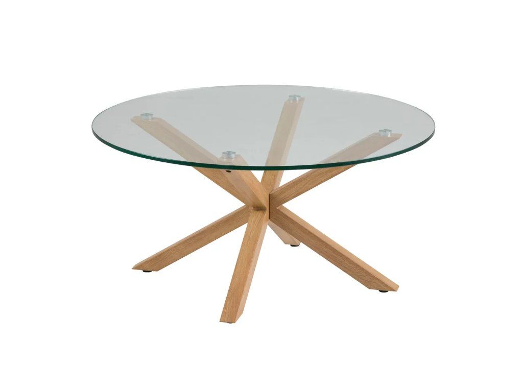 Štýlový okrúhly konferenčný stolík Heaven od Actona s priemerom 82 cm kombinuje sklenenú dosku s kovovými nohami v dekore duba. Severský dizajn s karamelovo hnedými nohami vytvára elegantný a moderný vzhľad. Nosnosť 20 kg, výška 40 cm. Ideálny doplnok do obývačky s praktickým využitím priestoru.