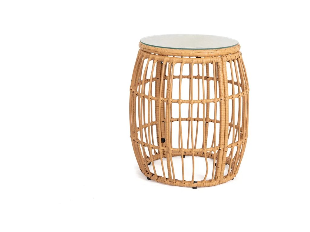 Vyrobené z umelého ratanu, v prírodnej farbe, ø 47 cm, výška 53,5 cm. CHÝBA VRCHNÁ SKLENENÁ DOSKA!