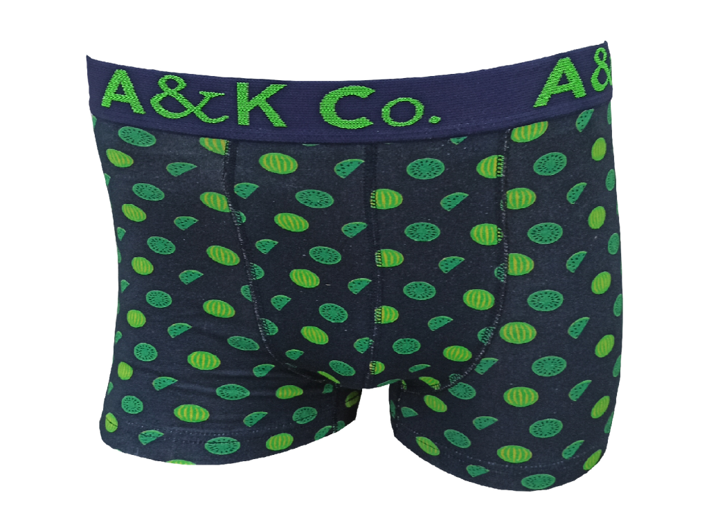 Obsah balení jsou boxerky s melounovým vzorem, boxerky bez vzoru ve tmavě zelené a tmavě modré barvě.