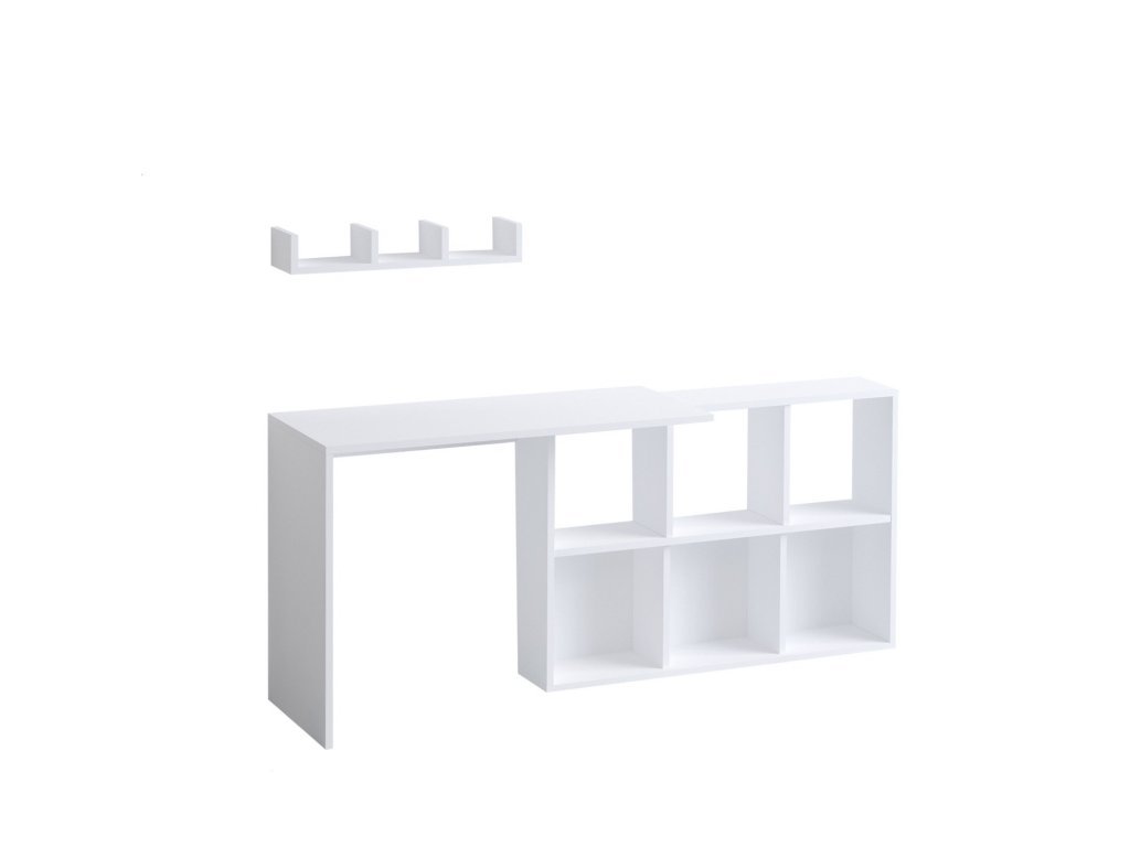 Biely písací stôl JACK ponúka pracovnú dosku spojenú so šesťdielnym regálom a nástennou policou s drobnými priečkami.