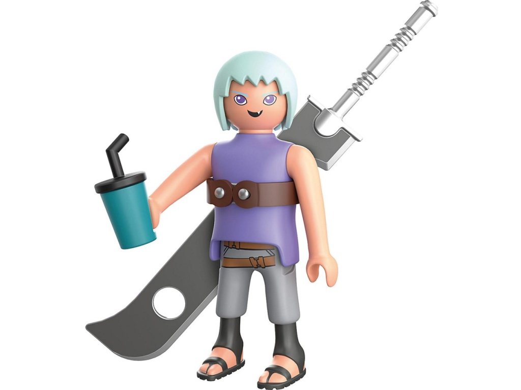 Sada PLAYMOBIL zobrazuje postavu Suigetsu NARUTO SHIPPUDEN ve fialové košili bez rukávů s šedými kalhotami a sandály. V koutku úst je vidět jeden z jeho tesáků. Kolem hrudi nosí tlustý hnědý pás, ke kterému je připevněn jeho meč.