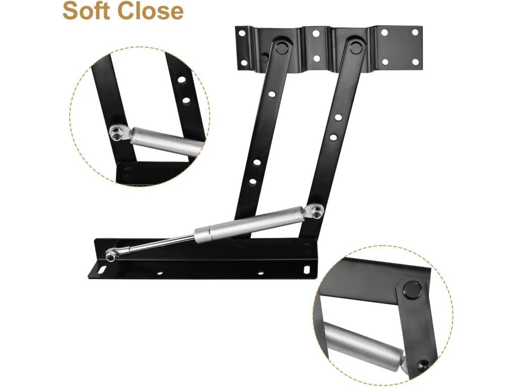Obsah balení: 2 ks zdvihacích skládacích rámů (folding bracket). Technické údaje: materiál ocel; barva černá; montážní typ: povrchová; počet otvorů: 17; maximální nosnost: 100 lb (cca 45 kg); povrch: unfinished; výrobce: iBIGXI Direct; značka: Enenes; model: Folding Brackets; ASIN: B08CX8GQ3F.