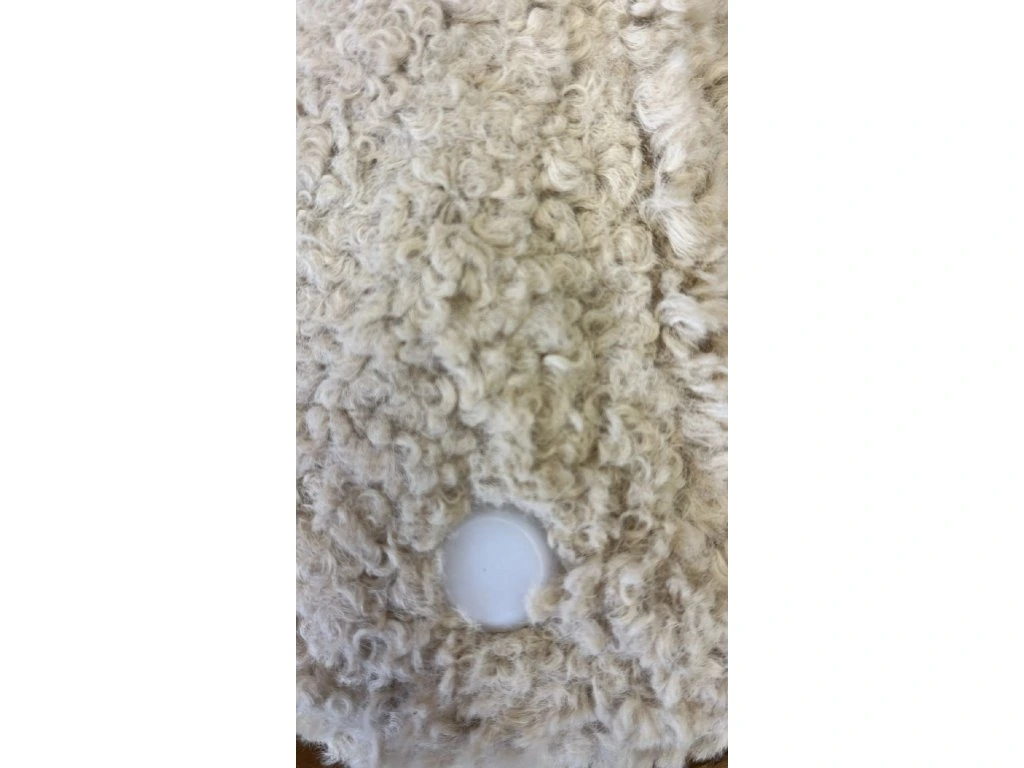 Z textílie buclé, polstrovaná, krémová, šírka 100 cm, hĺbka 45 cm, výška 45 cm. CHÝBA JEDNA PLASTOVÁ NOŽIČKA