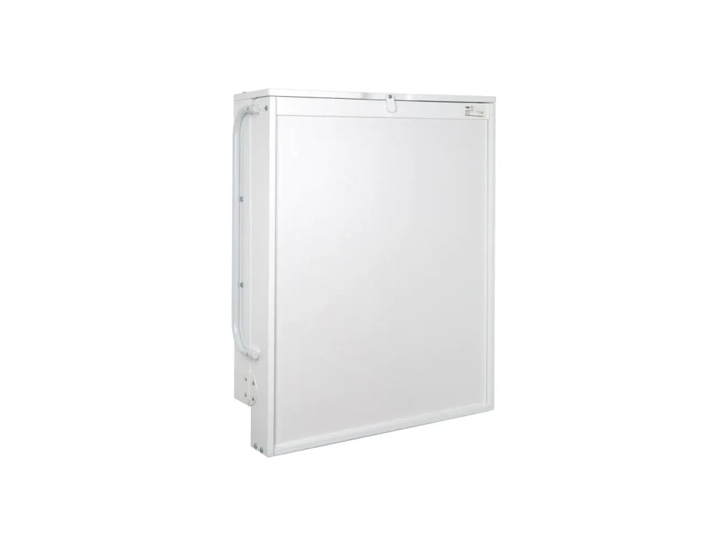 Z drevotriesky, povrchová úprava: melamín, matný, biely, šírka 67 cm, výška 78 cm, hĺbka 76,5 cm, závesný.