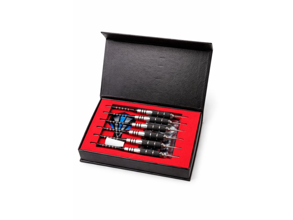Elegantná sada kvalitných kovových šípok v praktickom púzdre, ideálna pre rekreačných aj pokročilých hráčov.