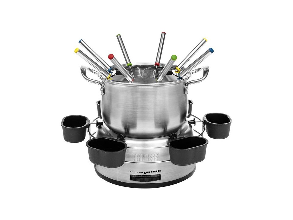 Společně se sadou Princess Family Fondue získáte šest barevně odlišených nerezových vidliček na fondue, abyste si mohli užít slavnostní fondue s celou rodinou. Praktický omáčkový držák lze použít nejen k podávání omáček, ale také sladkých ingrediencí pro čokoládové fondue, jako je kokos nebo oříšky. Nastavitelný termostat s výkonem 800 W zajišťuje, že můžete vždy zvolit optimální teplotu pro každý typ fondue.