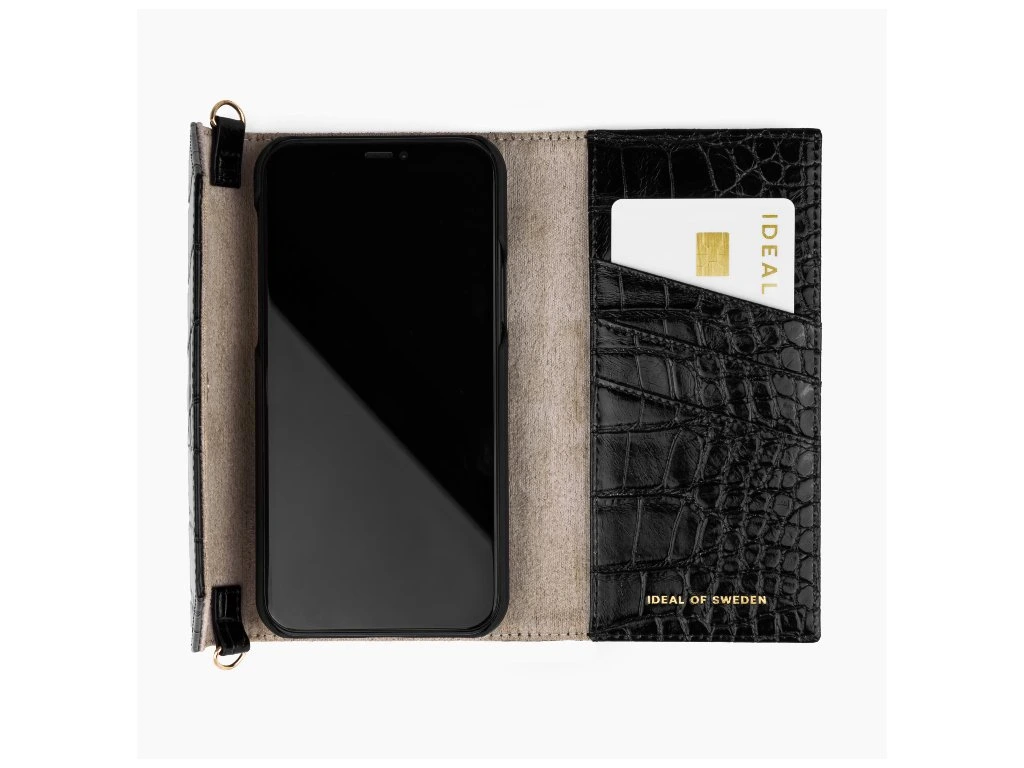 Štýlové púzdro-peňaženka iDeal of Sweden v čiernej farbe s krokodílou textúrou pre iPhone 11 Pro Max/XS Max. Vyrobené z vegánskej kože, obsahuje 3 priehradky na karty, priehradku na bankovky a magneticky odnímateľné puzdro na telefón. Vybavené 17cm pútkom na zápästie a diskrétnym magnetickým zapínaním.