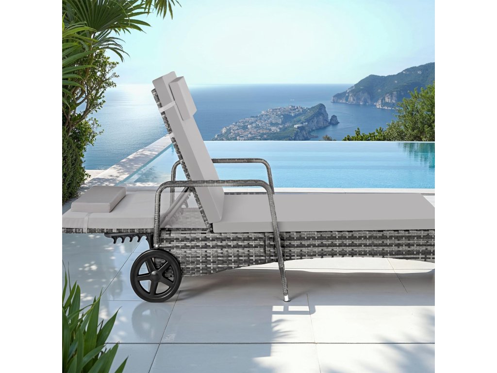 Ideální také k relaxaci na pláži. Snadné přemisťování pomocí dvou koleček je nespornou předností tohoto lehátka. Polohovatelná zádová část dělá z tohoto ratanového lehátka opravdu univerzální zahradní nábytek, kde si vychutnáte sladké lenošení vleže, ale stejně tak zde můžete vsedě pohodlně přečíst knihu, nebo soustředěně pracovat na notebooku. Rozměry (DxŠxV): 200 x 70 x 33 cm Rozměr matrace (DxŠ): cca 198 x 54 cm Tloušťka matrace: 5 cm Výška od země cca: 33 cm Výška područek: 57 cm Hmotnost: 15 kg Nosnost: 120 kg Materiál: Polyratanová plátnová vazba, polštáře ze 100% polyesteru, kovový rám Nastavitelná opěradla ve výšce: 33,5-57-70-80-90-100 cm