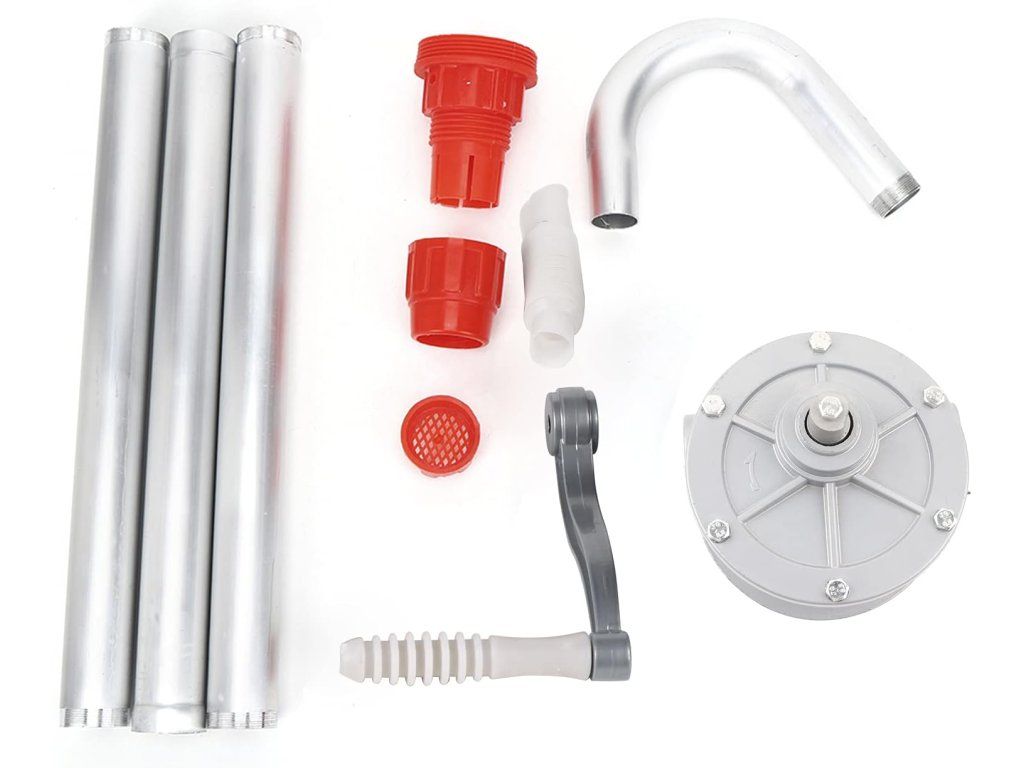 Obsah balení a technické údaje: 1× pumpa, 1× ruční klička, 4× olejová hadice, 1× filtrační síťka, 2× pevné víčko. Materiál: hliníková slitina. Průměr: 25 mm (1 palec). Průtok: 25–38 m3/h. Výtlak (hlava): 5–6 m. Provoz: manuální, jednovstupní. Hmotnost: cca 1,33 kg. Upozornění: nový a starý typ mohou být odeslány náhodně — objednávejte pouze pokud vám to nevadí.