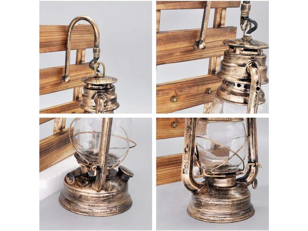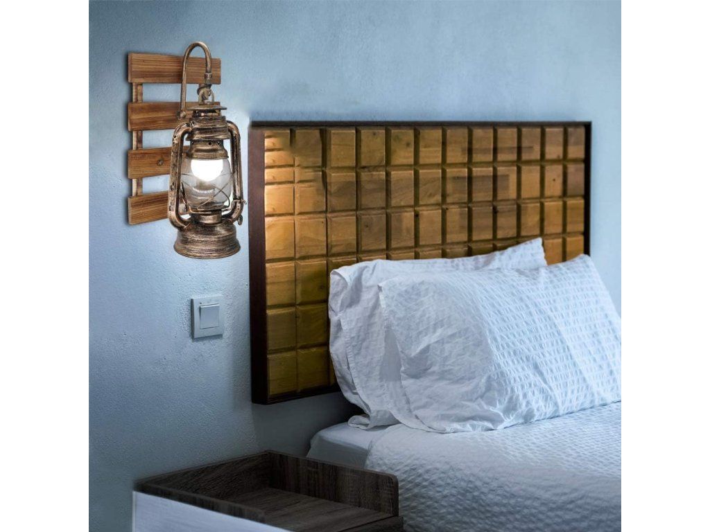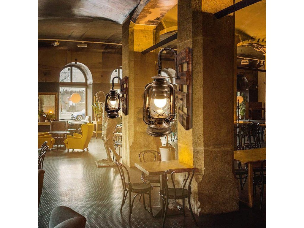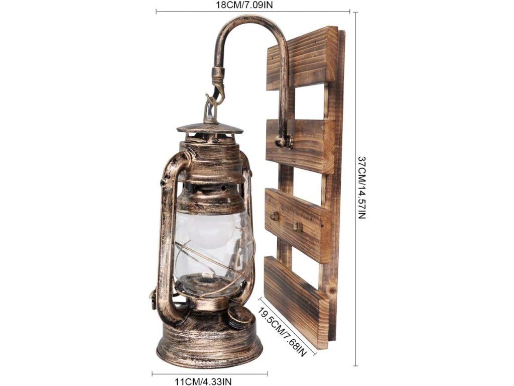 Rustikální nástěnná lampa ve stylu petrolejky dodá interiéru teplou atmosféru a industriální kouzlo. Kombinace kovu, dřeva a čirého skla vytváří dekorativní prvek vhodný pro domácnosti i komerční prostory.