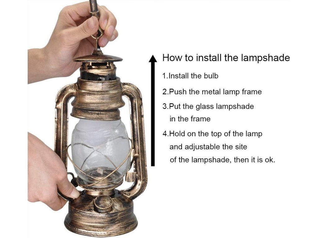 - Design a materiál: Kovové tělo se starožitným vzhledem, dřevěný podstavec s háčkem a čiré skleněné stínidlo.