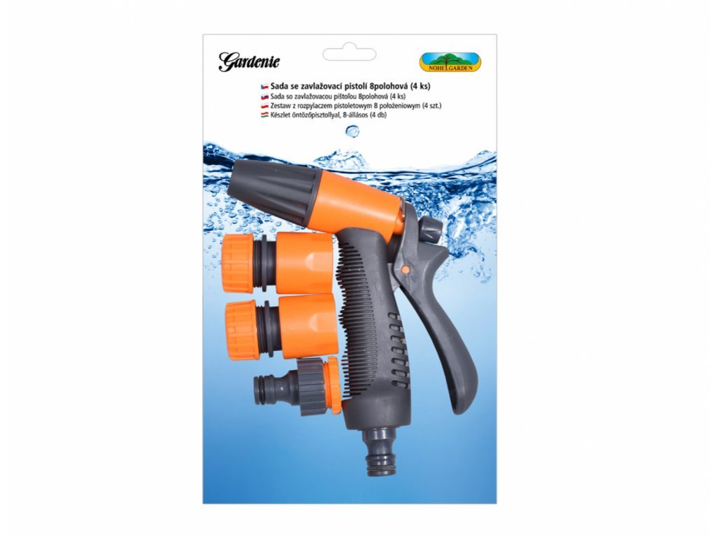 Súprava s plastovou regulovateľnou pištoľou a spojkami. Farba: oranžovo čierna. Balenie: 4 ks.