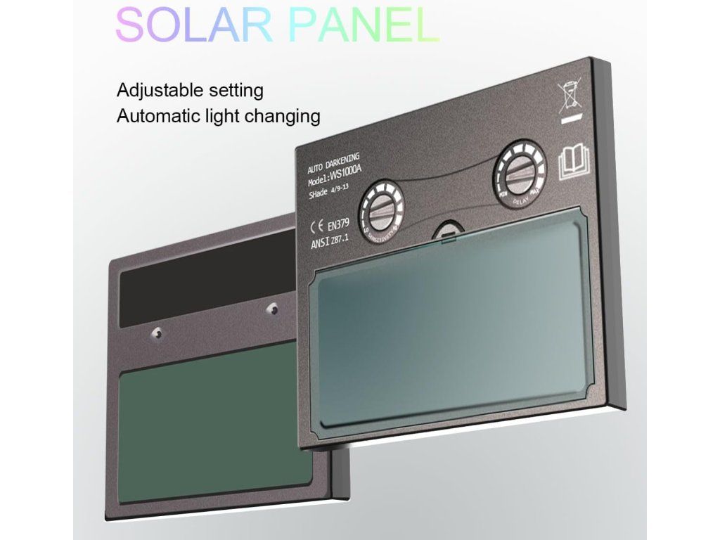 Samozatmievacia kukla s technológiou True Color a optikou 1/1/1/2 pre presné videnie zváracieho spoja; solárne napájanie s vymeniteľnou CR2032 batériou a nastaviteľným upínaním pre pohodlie pri dlhej práci.