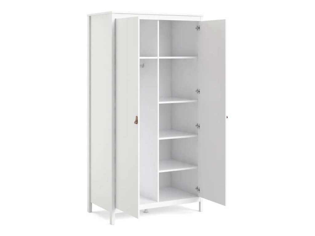 Barva Bílá Šířka 102 cm Výška 199 cm Hloubka 58 cm Váha 84.5 kg Nosnost 140 kg Výška nohou 10 cm Materiál Dřevotříska Dekor Matný Povrchová úprava Folie Materiál nohou MDF, plast Materiál úchytek Kov, kůže Materiál zadní části Dřevovláknitá deska Vlastnosti S dvířky, s poličkami, se skříňovou tyčí Péče Čistit suchým hadřikem, nepouživat agresivní a abrazivní čističe Systém zavírání Bez tlumení Typ skříně Uzavřená, s pantovými dveřmi