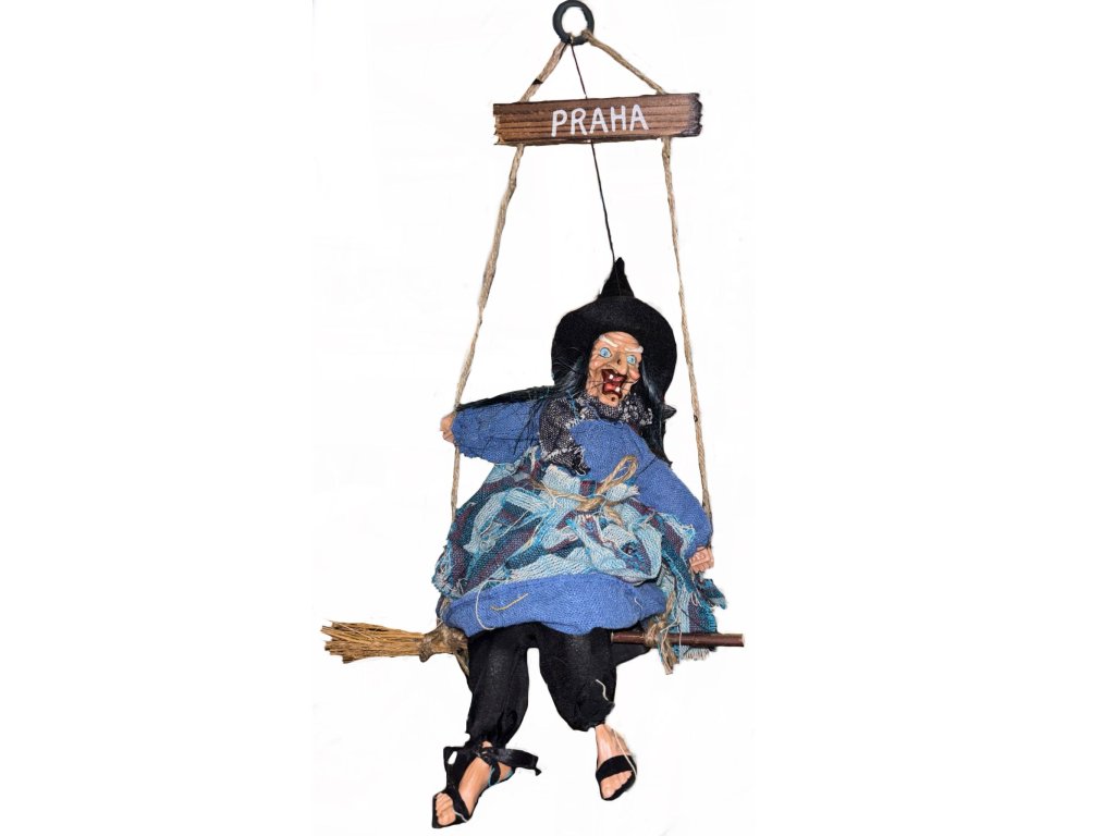 Závesná dekorácia - Sediaca čarodejnica na metle s ceduľou 'PRAHA'. Rôzne druhy. Batérie nie sú súčasťou.