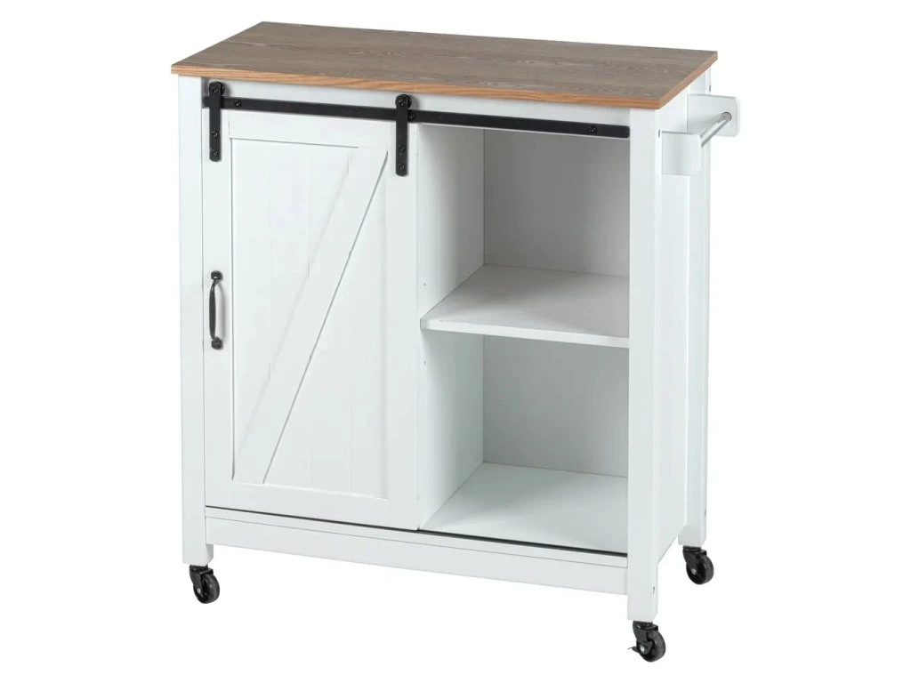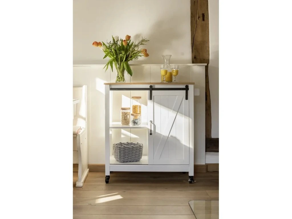 Stolík na kolieskach Country House od značky Wenko ponúkne dostatok priestoru na uloženie všetkých servírovacích potrieb. Vďaka dvom posuvným dvierkam navyše obsah zostáva dokonale skrytý. Držiak na utierku je možné v prípade potreby využiť ako madlo pre pohodlnú jazdu. VRCHNÁ DOSKA MÁ ŠKRÁBANEC NA ROHU POZRI FOTO.