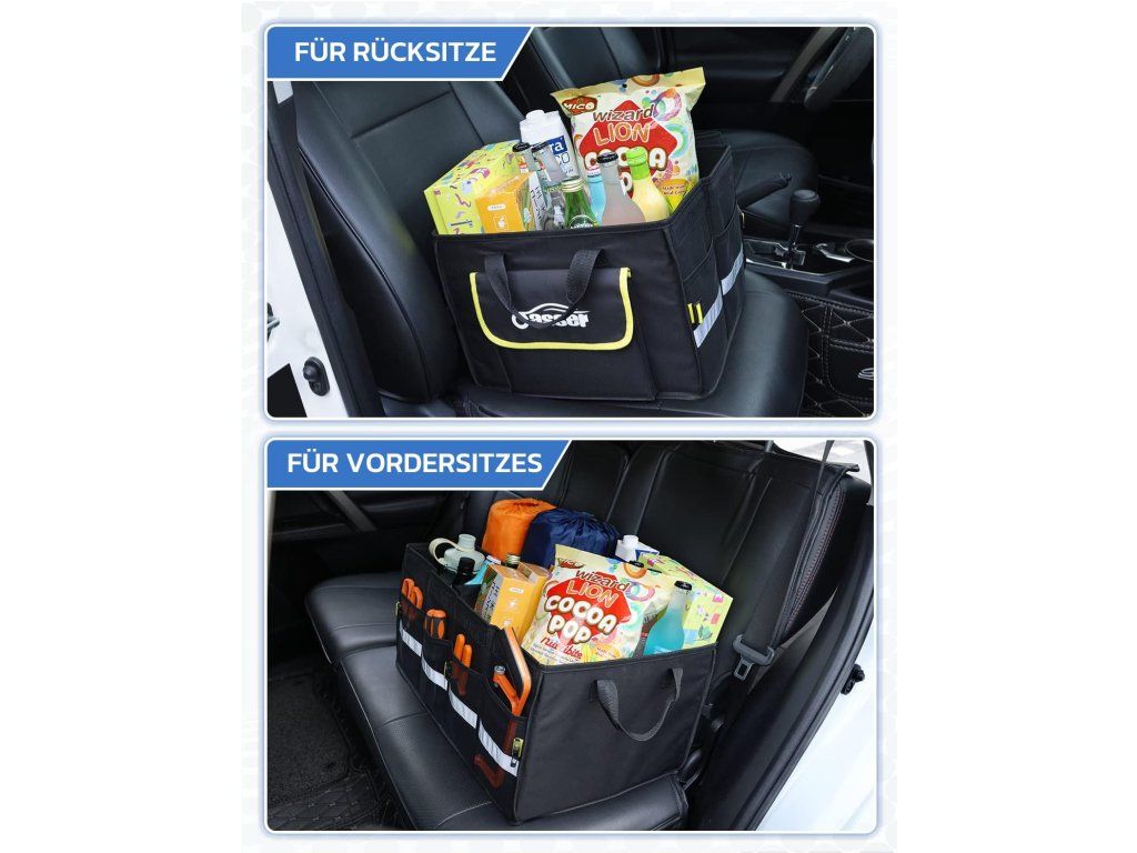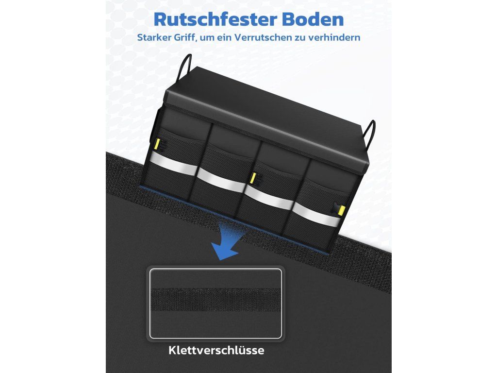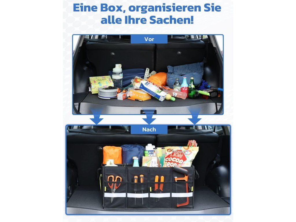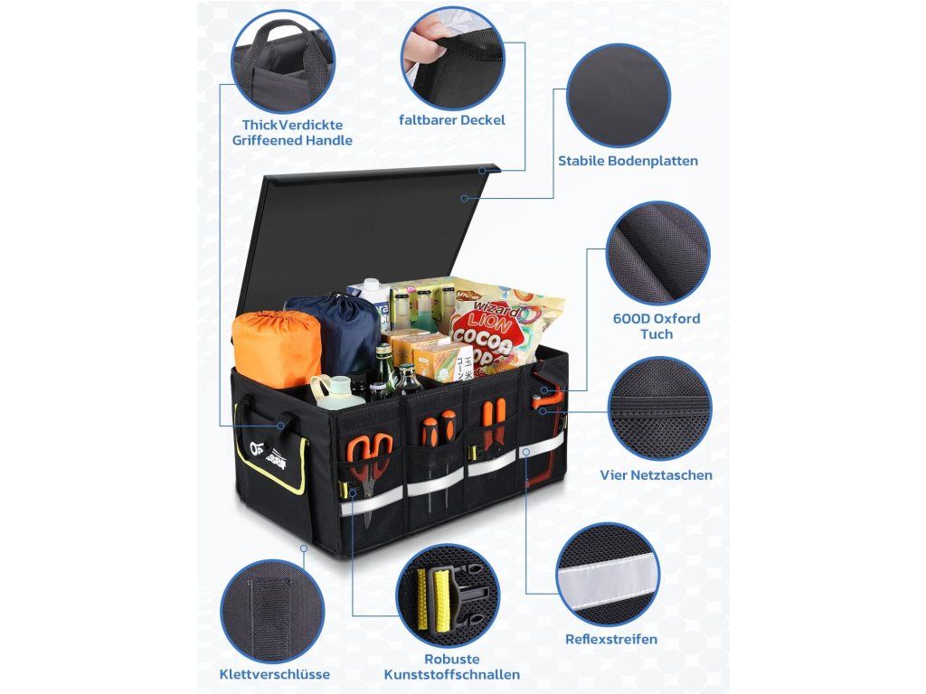 Udržte batožinový priestor prehľadný vďaka pevnému, vodeodolnému organizéru s 55l kapacitou a reflexným pásikom pre väčšie bezpečie. Skladacia konštrukcia a odnímateľné prepážky ponúkajú flexibilné usporiadanie a jednoduché prenášanie.